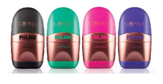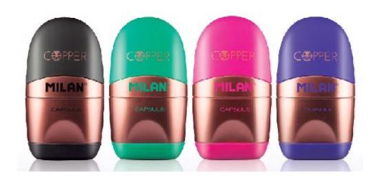 Afilaborra Milan en color cobre combinados con cuatro colores diferentes. Sacapuntas con depósito y tapa protectora con cuchilla de seguridad de acero al carbono. Goma Milán incorporada y reemplazable. Artículo con tacto goma