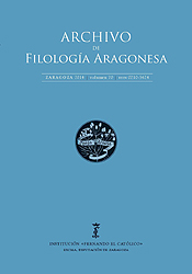 José M.ª Enguita Utrilla, "Presentación", pp. 9-12. ESTUDIOS: Miguel Carabias Orgaz, "¿Por qué unos fueros escritos en lengua romance? La redacción primigenia de los Fueros de Aragón, pp. 15-34; María José Ayerbe Betrán, "Distribución discursiva y sintáctica del uso del futuro de indicativo por los presentes de indicativo o de subjuntivo en la Grant crónica de Espanya de Juan Fernández de Heredia, pp. 35-58; Francisco Sangorrín Guallar, "Algunos problemas en torno a la versión aragonesa del Libro de Marco Polo (siglo XIV)", pp. 59-86; Ana Mateo Palacios, "Aragonesismos y catalanismos en la traducción castellana realizada por Gonzalo García de Santa María de Las vidas de los sanctos religiosos de Egipto", pp. 87-114; Pablo Cuevas Subías y Sergio Paúl Cajal, "El Examen de ingenios para las ciencias de Juan Huarte de San Juan y la Universidad de Huesca", pp. 115-144; Marta Pérez Toral, "Huellas de lo oral en documentos notariales turolenses del Siglo de Oro", pp. 145-168; Rosa Mª Castañer Martín, "Una ilustre familia aragonesa: Braulio, Francisco y Vicente Foz", pp. 169-200; Juan José Navarro Avilés, "La evolución lingüística en Aires murcianos, de Vicente Medina", pp. 201-226; Mª Luisa Arnal Purroy, "Léxico regional y diccionarios: la definición 'seudoperifrástica'", pp. 227-250. NOTAS BIBLIOGRÁFICAS: María José Ayerbe Betrán, "El Aragón ilustrado", pp. 251-270; Rosa Mª Castañer Martín, "María Antonia Martín Zorraquino. Un merecido homenaje académico", pp. 271-288. RESEÑAS: Elena Albesa Pedrola: María Teresa Moret Oliver y Guillermo Tomás Faci, El pleito del guiaje ganadero de Ribagorza (1316-1319). Edición y estudio histórico-lingüístico, pp. 289-291; Daniela Santonocito: Ana Mateo Palacios (ed., introd. y notas), Flor de virtudes, pp. 292-295; Rosa Mª Castañer Martín: José Eugenio Borao Mateo, Jerónimo Borao y Clemente (1821-1878). Escritor romántico, catedrático y político aragonés, pp. 296-297; José Mª Enguita Utrilla: Juan Domínguez Lasierra, Benjamín Jarnés (1888-1949). Bibliografía, pp. 298-301; José Mª Enguita Utrilla: Manuel Hernández Martínez (coord.), Sobre una generación de escritores (1936-1960). En el centenario de Ildefonso Manuel Gil, pp. 302-304; Mateo Montes Fano: Vicente Ferraz Castán, Vocabulario del dialecto que se habla en la Alta Ribagorza, pp. 306-307; Elena Albesa Pedrola: Emili Casanova y Pep Aparicio Aguadas, Camins, terres y paraules. II jornades sobre els altres parlars valencians de base castellano-aragonesa (Énguera 2013), pp. 308-312.