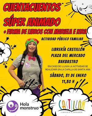 Mariela e Isra, fundadores de la editorial zaragozana Hola Monstruo vuelven al centro de Barbastro para incitar a lectura de una forma activa y divertida. La plaza del Mercado (Librería Castillón) será testigo de una sesión que comenzará con un cuentacuentos invernal. Seguidamente autora e ilustrador firmarán y dedicarán ejemplares de sus obras.