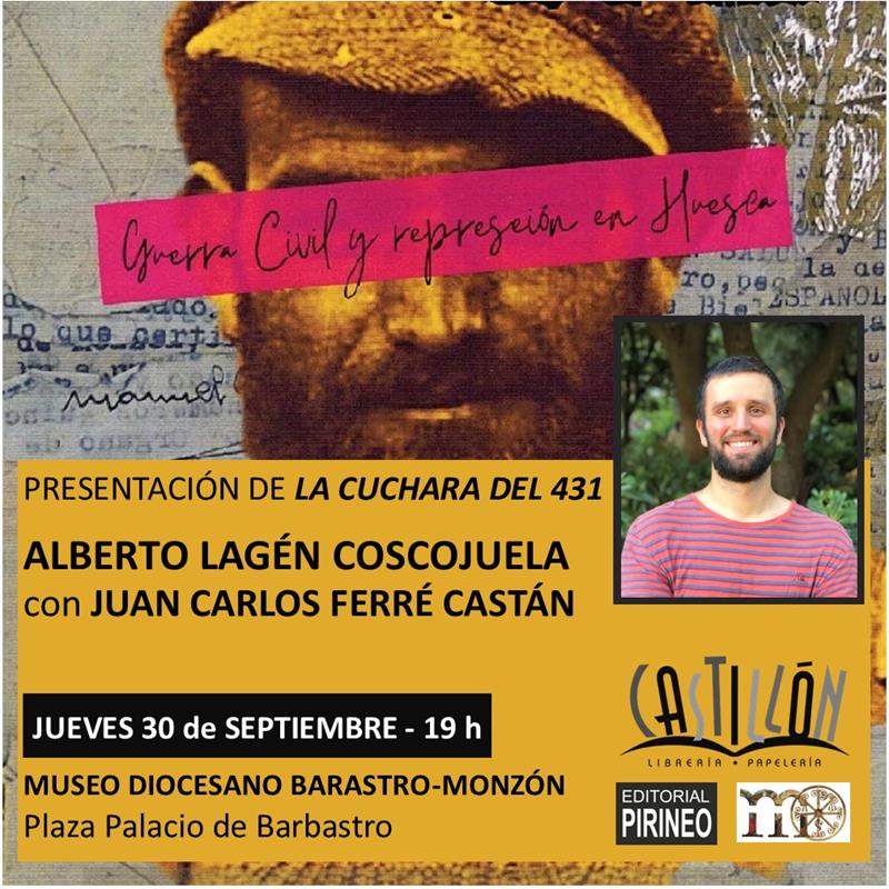 El jueves 30 de septiembre a las 19 horas, en el Museo Diocesano de Barbastro tenemos una cita con dos historiadores de prestigio: Alberto Lagén Coscojuela y Juan Carlos Ferré Castán. Alumno y profesor se reencontrarán años después para charlar y desgranar todos los entresijos de la novela “La cuchara del 431”.