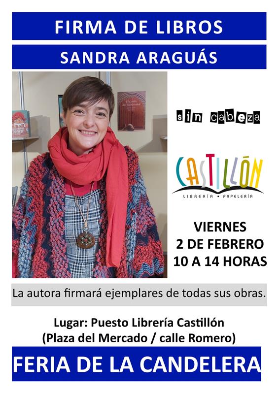 El viernes 2 de febrero, de 10 a 14 horas, Sandra Araguás (un año más) compartirá cuentos, charradas y firmas con los lectores y lectoras que se acerquen al puesto de Librería Castillón (en la confluencia de la plaza del Mercado y calle Romero).