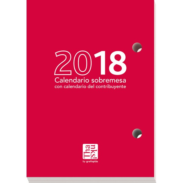 Repuesto anual 2018 para calendario sobremesa de 2 anillas, en castellano.· Papel blanco de 70 g/m2.· Cuatro idiomas nacionales.· Con calendario del contribuyente.· Santoral.· Impresión a 2 tintas.· Días transcurridos y para terminar el año.· Con 2 calendarios por página (mes en curso y mes siguient...