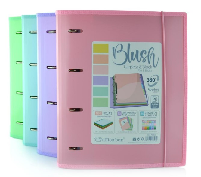 Carpeta de 4 anillas con cierre de goma elástica. Ribeteada en tela para una mayor resistencia. Equipada con separadores con bolsillo, recambio cuadriculado en colores y etiquetas para organizar los contenidos.Colección Blush de Office Box en colores pastel.
