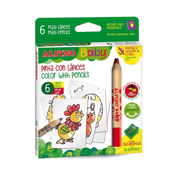 Set de 6 lápices de colores gruesos y mina blanda y 6 Cartas de animales de granja para colorear. Diseñados especialmente para los más pequeños, ideales para aprender a controlar el trazo. Contiene sacapuntas especial y una guía pedagógica. Todos los productos Alpino Baby están diseñados para los más pequeños, pensados para ayudarles a desarrollar la psicomotricidad fina, estimular su creatividad y motivar su capacidad de relacionarse con el entorno. Edad Recomendada: A partir de 18 meses. Advertencia, el sacapuntas especial no es parte del Juego, y debe ser manipulado exclusivamente por un adulto. Retirar el sacapuntas antes de dar el juguete al niño.
