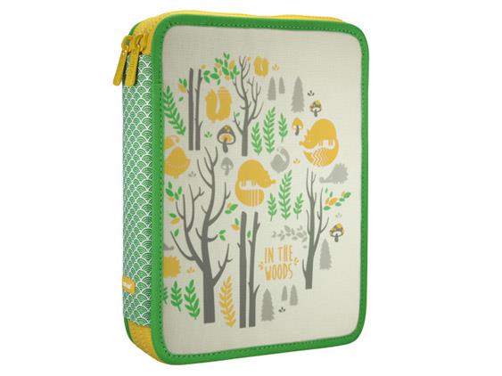 Plumier dos pisos grande con contenido, colección IN THE WOODS. Tejido 100% poliéster. Contenido: 18 rotuladores, 5 evidenciadores (amarillo, naranja, verde, rosa y azul), 3 bolígrafos (azul, negro y rojo), tijeras, 12 lápices de colores triangulares, 12 Plastipastel, 2 lápices de grafito HB, regla de 15cm, sacapuntas Afila y 2 gomas de borrar de miga de pan MILAN.