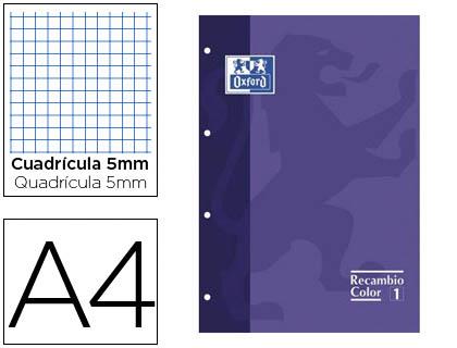 Recambio color oxford din a4 80 hojas 90 grs cuadros 5 mm 4 taladros lila.80 hojas. Din a4. 4 taladros. Papel de 90 g/m2. Banda y cuadrícula del mismo color. Cuadrícula de 5 mm.