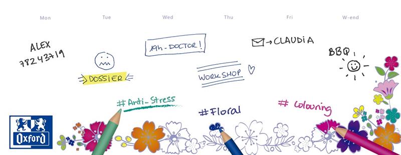 Oxford ha creado un bloc multifuncional para tomar notas: un bloc sobremesa con planificador y estampados florales para colorear. De esta forma el usuario puede planificar, anotar tareas y colorear para relajarse.