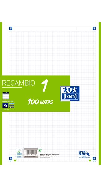 • RECAMBIO OXFORD A4 100 H CUADRÍCULA 5 MM BANDA COLOR VERDE