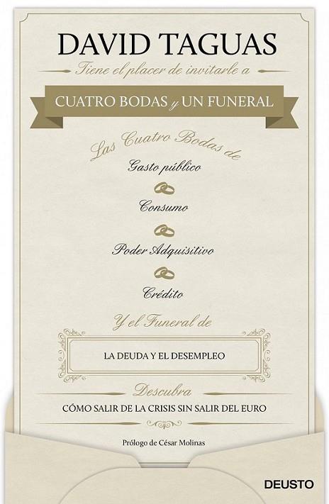 David Taguas, reputado economista, reflexiona en este libro sobre la actual situación económica de nuestro país y expone sus propuestas para conseguir una pronta recuperación. En primer lugar, repasa los hechos que dieron lugar a la crisis y, para ello, relata lo que llama las cuatro grandes bodas de nuestra economía, a saber: nuestro apego al gasto público –que se traduce en un escaso rechazo social a mantener elevados porcentajes de déficit–; nuestra excesiva ponderación del presente en la elección intertemporal entre consumo y ahorro –lo cual es el origen de una disparatada política fiscal que penaliza extraordinariamente el ahorro–; nuestra creencia en que debe mantenerse siempre y en cualquier circunstancia el poder adquisitivo de los trabajadores –un principio tan arraigado que ha entorpecido gravemente las relaciones laborales– y, por último y como cuarta boda, la excesiva dependencia del crédito –lo cual ha motivado una deuda pública y privada sin precedentes. Cuatro bodas que tuvieron un fatal desenlace: el funeral de la economía española, inmersa desde hace más de seis años en una crisis económica de la que no levanta cabeza debido a la deuda externa –que pesa como una losa y dificulta la recuperación– y a una tasa de paro que a lo largo de estos años se ha incrementado desde un 8 por ciento al actual 26 por ciento, una cifra histórica en España. ¿Qué hay que hacer para revertir la actual situación? En su hoja de ruta, Taguas aboga por reducir el gasto público en cinco puntos del PIB (bajando del 46 al 41 por ciento en 2016), reducir los impuestos a familias y empresas, reformar la Administración y las empresas públicas e impulsar políticas que incrementen la competencia. Con tales medidas, el ahorro aumentaría 11 puntos del PIB, la inversión volvería al 25 por ciento, se crearía empleo y se conseguiría un significativo crecimiento económico. Y, todo ello, de la mano de Europa, socio imprescindible para conseguir una pronta recuperación económica