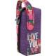 Colección de mochilas y estuches realizada en poliéster 600x600D con un acabado morado jaspeado combinado con flores y con el Lema Live your life en serigrafía.