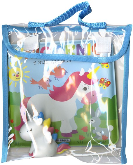 Un libro de plástico acolchado con ilustraciones a todo color de un simpático unicornio y sus amigos, y un muñeco de goma con sonido pensados para que los más pequeños de la casa disfruten siempre de la hora del baño.