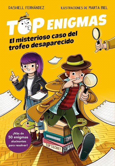 ¡Una narrativa detectivesca que incluye ingeniosos enigmas intercalados que deberás resolver para descubrir la trama al completo! Mi nombre es Sabueso Jenkins. Déjame decirte una cosa: a veces el mundo del espionaje no es tan sencillo como parece. Trabajo con Laura Giallo y nuestra oficina es un pupitre al fondo de la clase lleno de casos sin resolver. La verdad es que estamos buscando un buen fichaje para la agencia TOP ENIGMAS. Necesitamos resolver el caso del trofeo perdido y... algunos más. ¿Te animas?