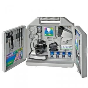 Incluye un gran maletín con todo tipo de accesorios: pequeño proyector para amplificar la visión, preparados permanentes, portaobjetos con cubreobjetos de vidrio, diferente instrumental ¡y mucho más! Fabricado en metal fundido. Incluye 68 piezas en total y guía de manejo de fácil comprensión, redactado especialmente para los lectores más jóvenes.