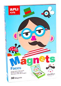 Juego magnético para crear diferentes caras sobre un escenario extraíble, apto para colocar en la caja. Los niños pueden crear diferentes caras, tanto las que se sugieren como las que se puedan inventar combinando los diferentes elementos. Ilustrado en exclusiva por Stocklina.