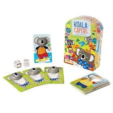 ¿¡La familia Koala se va de viaje! y tendrás que ayudarles a vestirse. Sé el primero en conseguir 5 cartas de conjuntos para estos simpáticos koalas... pero ten cuidado si te sale en el dado "ropa interior"! Este juego divertidísimo combina observación y memoria.