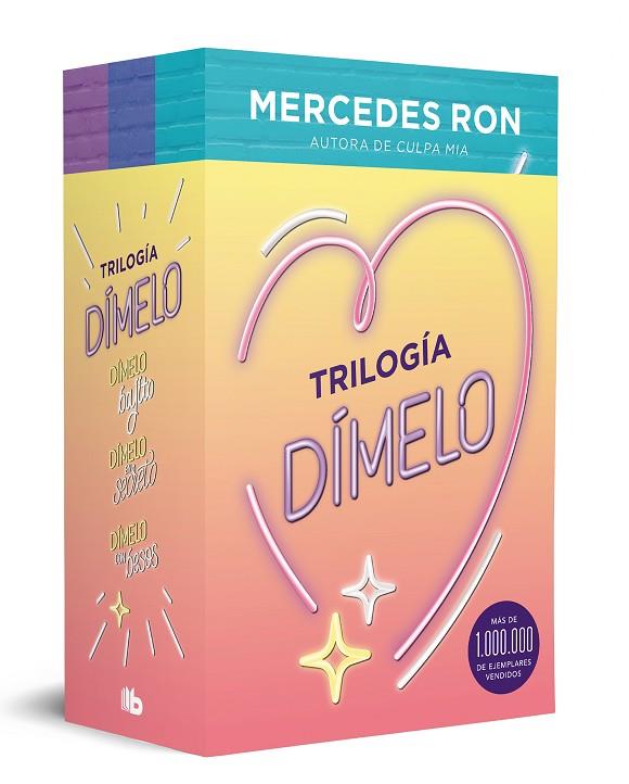Este estuche reúne los tres libros de la trilogía más romántica de Mercedes Ron, la autora Nº1 que ha seducido a más de 300.000 lectores con Culpa mía. ENAMÓRATE DE LOS HERMANOS DI BIANCO. TUS MEJORES AMIGOS. TU MAYOR PERDICIÓN. Dímelo bajito (Dímelo 1) Kamila Hamilton lo tenía todo bajo control... o eso creía: no entraba en sus planes que los hermanos Di Bianco volviesen de nuevo para poner su mundo al revés. Thiago fue quien le dio su primer beso. Taylor el que siempre la protegió. El regreso de los hermanos hace que la vida aparentemente perfecta de Kami se tambalee. Ella ya no es la niña inocente que conocieron: desde que se fueron, parece que nadie puede acceder realmente a ella... nadie excepto ellos. ¿Podrá resistirse Kami a la simple presencia de Thiago? _______________________________ Dímelo en secreto (Dímelo 2) Kamila Hamilton vuelve a tener a sus dos mejores amigos en su vida. El problema es que Taylor y Thiago Di Bianco ya no son simples amigos. Ahora son mucho más. Thiago y sus ojos verdes la dejan sin respiración. Taylor y sus ojos azules jamás la decepcionarán. Los hermanos han crecido y junto a ellos lo que siente Kamila. Y ahora que su vida se desmorona por momentos, su familia se desintegra y sus amigas le dan la espalda, los necesitará más que nunca... a los dos. ¿Cómo reaccionará Kami cuando Thiago bese otros labios? _______________________________ Dímelo con besos (Dímelo 3) Kamila Hamilton debe decidir entre los dos hermanos Di Bianco: Thiago o Taylor... Taylor o Thiago. Escoger a uno significa renunciar al otro, pero ¿cómo puede dejar atrás una parte de sí misma? Thiago hace que toque el cielo con los dedos. Taylor sabe que jamás va a soltar su mano. Pero cuando Kami cree que por fin su corazón ha decidido, la pesadilla más real está a punto de comenzar. Los lectores han dicho...