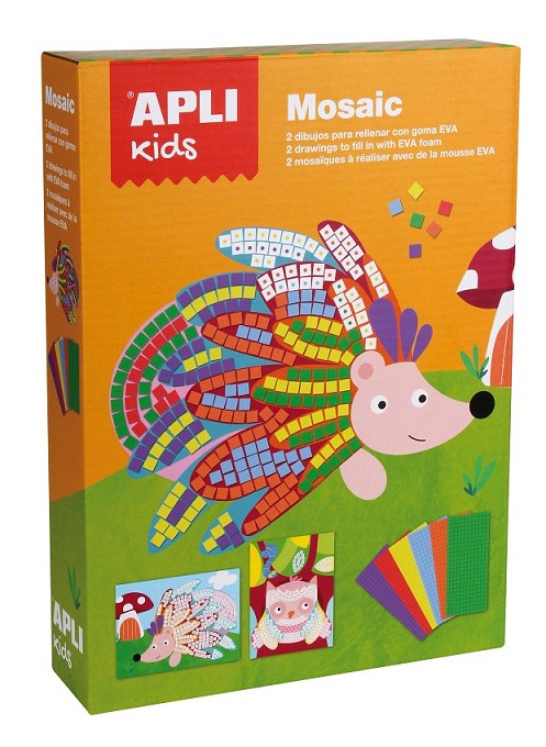 Juego para crear mosaicos con diferentes temáticas. Las plantillas incluyen un punto de color que sirve de guía para colocar las pegatinas de goma eva.