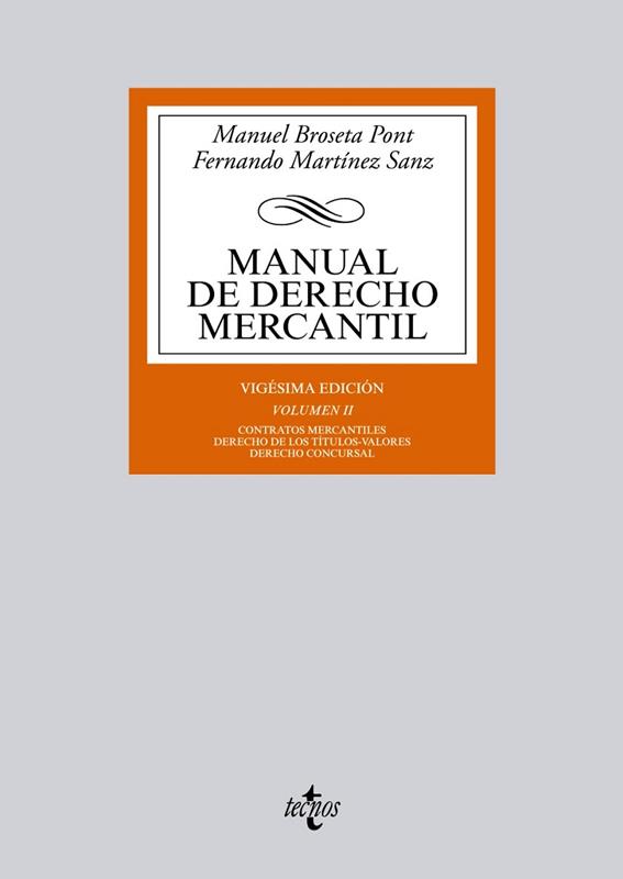 El segundo bloque de materias lo constituye el Derecho de los títulos-valores. Pese a la progresiva reducción que se aprecia en la práctica en el uso de estos instrumentos, se considera que su estudio continúa siendo fundamental para la adecuada comprensión de la disciplina mercantil y, en particular, de la contratación. En fin, el volumen se cierra con el análisis del Derecho concursal, de enorme relevancia práctica en una coyuntura económica como la que atraviesa España en estos momentos. Tras casi dos lustros de vigencia de la Ley Concursal, se empieza a contar con un cuerpo de decisiones del Tribunal Supremo sobre cuestiones de fondo en la materia, algunos de cuyos pronunciamientos se incorporan en el lugar oportuno.
