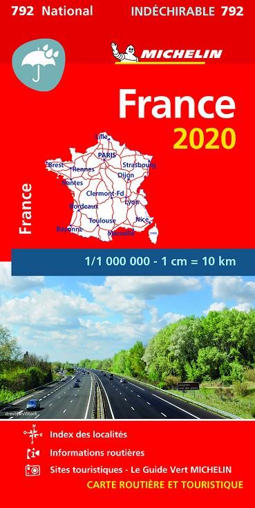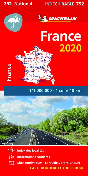 La edición actualizada del Mapa National Francia "Alta Resistencia", editado a escala 1/1 000 000, está fabricado en un papel especial que le confiere una mayor resistencia al agua, así como a las rasgaduras. Además, incorpora un índice de localidades y un cuadro de distancias.