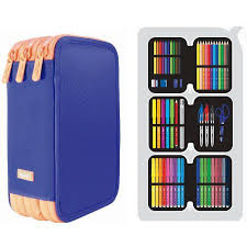 Plumier tres pisos colección DOTS III. Tejido: poliéster. Contenido: 18 rotuladores punta cónica, 12 lápices de colores triangulares, 10 Plastipastel, tijeras, 3 bolígrafos (azul, negro y rojo), 5 evidenciadores (amarillo, naranja, rosa, verde y azul), lápiz de grafito HB, regla de 15cm, sacapuntas ...