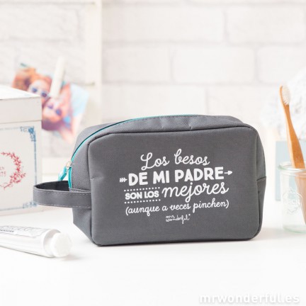 Un neceser muy especial para guardar todas esas cosas que un padre puede necesitar. Para que cada vez que lo abra para ponerse un poco de colonia, sepa que como sus besos de padre no hay nada igual, aunque a veces pinchen un poquito con su barba.
