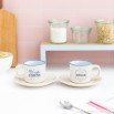 - Set de dos tacitas con platito, ideales para café espresso. Contienen mensaje para parejas.