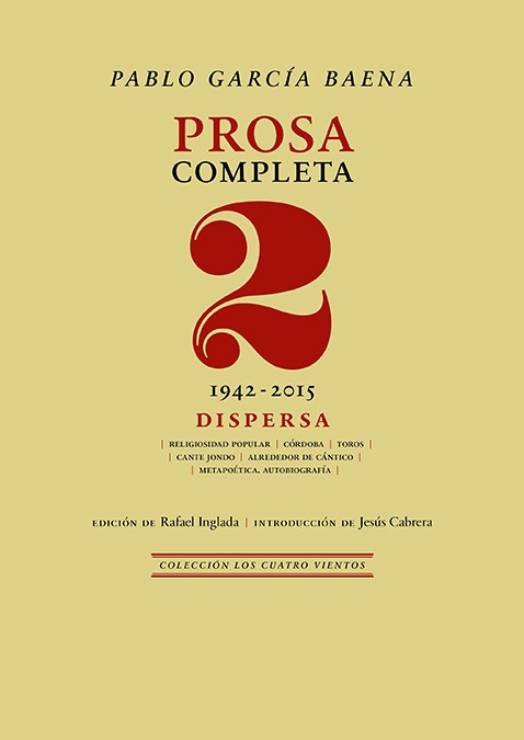 La prosa dispersa de Pablo García Baena (Córdoba, 1921-2018) es la de un poeta a pie de calle, a pie de su propia autobiografía. Textos que el autor rehusó publicar en sus libros mayores, tal vez por considerarlos que pertenecían a su «prehistoria» –como gustaba llamar irónicamente a su creación juvenil–, o porque correspondían a una simple anécdota literaria o a un compromiso amistoso del momento. Amistad sería la palabra adecuada para comprender esa escisión en donde, aun así, perdura y cabe toda Córdoba –la de su infancia y madurez– al paso nocturno de sus tradiciones; toda la ciudad nativa, de cuya historia cultural fue un acérrimo defensor, la de los toreros y la de las tabernas con el cante jondo, con ese «plasticismo necesario para levantar las arriesgadas columnas del grito». Pero también en donde cabe, y estas páginas lo corroboran, todo Cántico, que podríamos esbozar con aquellos versos de Jorge Guillén: «relaciones felices / entre quienes, aún mozos, / se descubrieron gustos, preferencias / en su raíz comunes. / ¡Poesía!». Y también los secretos de su propia palabra poética, en la cual, como el propio autor sentenció, «el poeta no va a salirse de su biografía interior». Todo este universo, que ahora rescata Renacimiento, ha permanecido durante décadas secuestrado por el tiempo, perdido en las olvidadas revistas de la época, en los periódicos que le abrieron las páginas al poeta para que penetrase, clara y firme, su voz, en los catálogos de las efímeras exposiciones, en presentaciones a amigos, en conferencias, en discursos… Un conjunto que no hace sino afianzar aún más, y descubrirnos a su vez, la inmensa figura de un García Baena inédito para muchos. «Lo contenido en este libro –como bien señala Jesús Cabrera a modo de presentación– es el equivalente a las carpetas que se guardan en el estudio del pintor, a los sucesivos dibujos y bocetos, o a los lienzos superpuestos y apoyados en el suelo que, a lo mejor, nadie ha visto en décadas. Es una historia paralela a la pública, tan válida e interesante como aquella, que nos muestra de forma directa y sin artificios la humanidad que hay en todo proceso creativo».