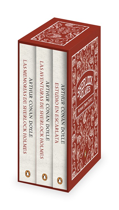 Estuche con las principales historias de Sherlock Holmes:Estudio en escarlata, Las aventuras de Sherlock Holmes y Las memorias de Sherlock Holmes.