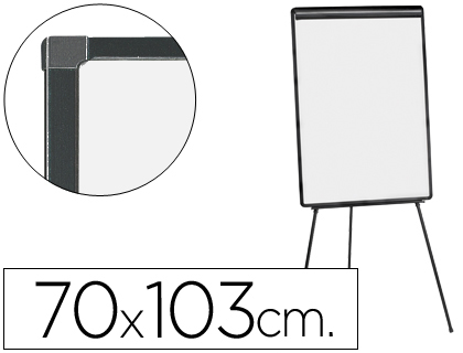 Pizarra trípode con marco de plástico negro. Superficie laminada en colorblanco, apta para la escritura directa con rotuladores de pizarra. Tambiénapta para bloc de papel gracias a su pinza superior. Con bandeja inferiorpara rotuladores y útiles. Medidas tablero: 70 x 103 cm.
