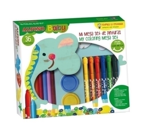 Set completo de pinturas superlavables, en colores vivos. Contiene: 4 botes de témpera de 40 ml, 4 esponjas con formas, 1 mural para pintar, 6 maxi ceras Alpino Baby, 6 rotuladores Alpino Baby y una guía pedagógica. Un set de actividades que estimula la creatividad de los más pequeños, mientras juegan y se divierten. Edad: + 3 años.