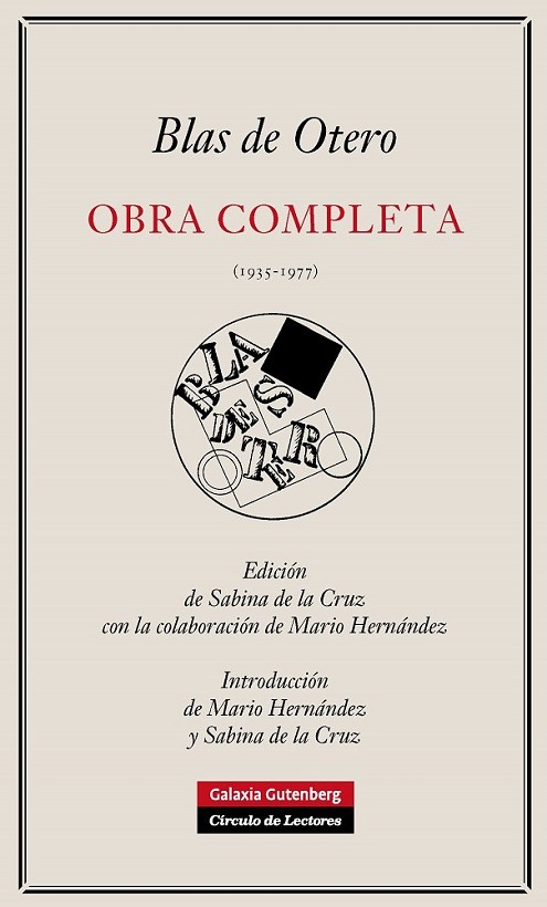 Por primera vez se reúne la «Obra completa» (1935-1977) de Blas de Otero. Este volumen unitario, de verso y prosa, acoge todos los libros que el poeta publicó en vida con otro póstumo, «Hojas de Madrid con La galerna, anticipado por esta misma editorial, y otros dos que dejó inéditos: «Poesía e Historia» (verso) y «Nuevas historias fingidas y verdaderas» (prosa). Una sucinta, y también inédita, «Historia (casi) de mi vida» rinde cuentas de obra y biografía. Un complemento de poemas inéditos y dispersos desde su primera juventud redondea la visión de la poesía oteriana, minuciosamente dispuesta por Sabina de la Cruz, su máxima estudiosa, que ha compulsado manuscritos e impresos para clarificar la obra de uno de los grandes poetas españoles del siglo xx. «Blas incita a un modo de estar o de ser, y engendra, mas nunca por la proximidad tribal de la persona, el raro vínculo de la fidelidad. Cayeron y caerán las mariposas deshojadas de las clasificaciones y las épocas. Blas es, él solo, una entera clasificación. Momento y época. Momento, nunca monumento. ¿Es Blas quizás el antimonumento? ¿Podría aguar con un brusco silencio la fiesta más solemne en su propia memoria, acaso un día declarada de interés nacional? Al fin, cuando ya haya pasado el tiempo falaz del abanico… y el muro blanco sea sólo blanco, Blas se hará más visible. Y así estará, sin pedestal ni altura, como fue y como es, como es difícil ser, secreto, verdadero, insobornable.» JOSÉ ÁNGEL VALENTE