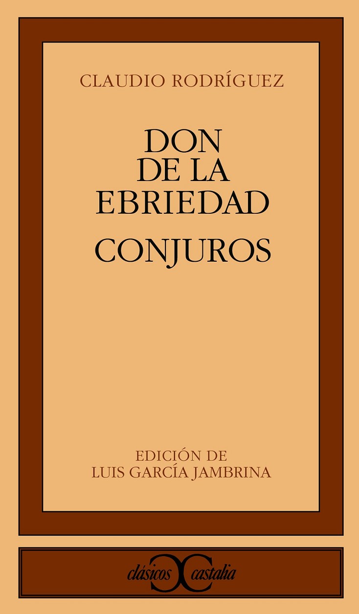 Se reúnen en un volumen los dos primeros libros de poemas de Claudio Rodríguez, Don de la ebriedad, reflejo de su adolescencia, y Conjuros, ya de su juventud. Don de la ebriedad (1953) es un solo poema dividido en fragmentos ordenados simbólicamente, en el que el tema constante es la emoción del poeta ante el paisaje contemplado, la claridad y la poesía como un don, la entrega del poeta al mundo a través del acto creador, y la tensión entre muerte y salvación que esto conlleva. Conjuros (1958) consta de veintisiete poemas distribuidos en cuatro "libros" o secciones en los que se hace patente un cambio en la actitud del poeta, que, con un lenguaje sencillo que habla de cosas, al parecer cotidianas, nos lleva al mundo trascendental de las verdades universales. Junto al tono exclamativo predominante, aparecen la meditación y reflexión características de su obra posterior.