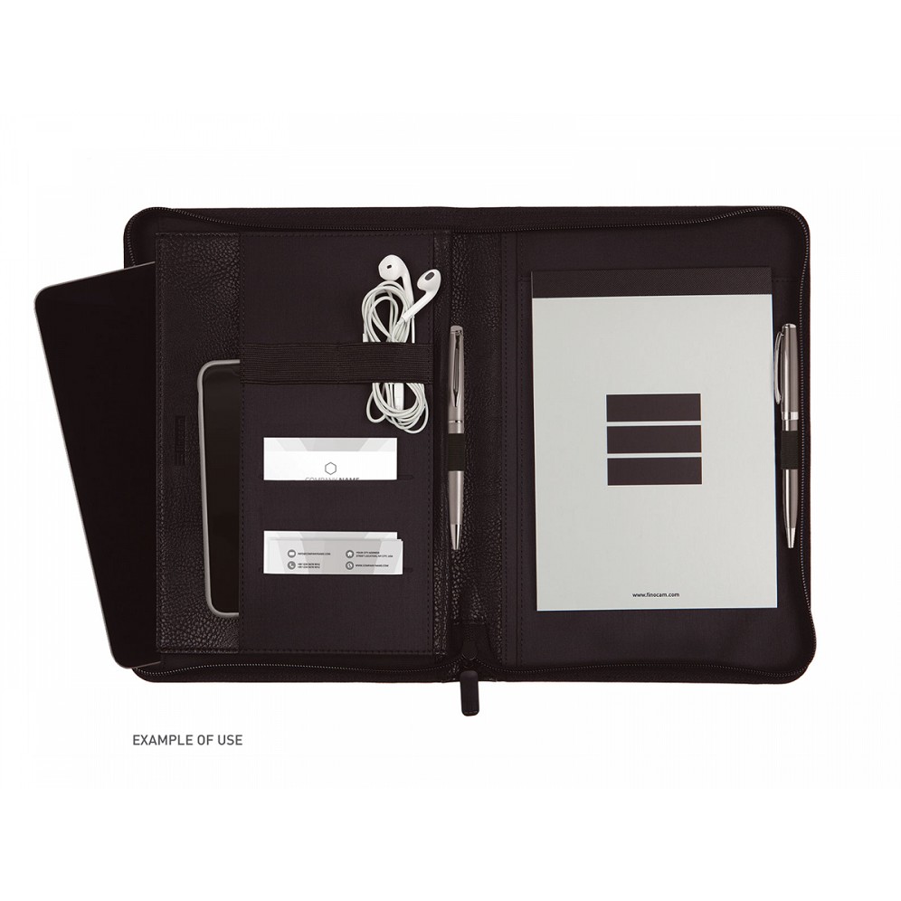 Portadocumentos de mano con cremallera. Incluye bloc de notas con taladros. Bolsillo interior con fuelle. Con gomas elásticas para la sujeción de utensilios de escritura, móvil, tarjetas y/o tablet hasta 10". Fabricado en poliuretano de alta calidad. Con capacidad para ubicar un tablet de hasta 10".