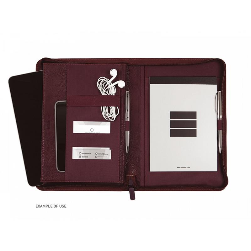 Portadocumentos de mano con cremallera. Incluye bloc de notas con taladros. Bolsillo interior con fuelle. Con gomas elásticas para la sujeción de utensilios de escritura, móvil, tarjetas y/o tablet hasta 10". Fabricado en poliuretano de alta calidad. Con capacidad para ubicar un tablet de hasta 10".