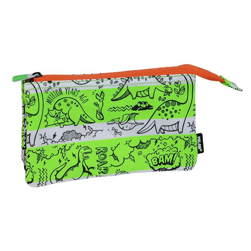 Portatodo 5 compartimentos. Edición especial Million Years Ago, color verde fluo y blanco. Composición tejido: exterior y forro interior de poliéster. Medidas: 22 x12 x 4 cm.