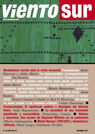 En este número 179 el Plural está dedicado a los "Movimientos rurales ante la crisis ecosocial".En este número 179 el Plural está dedicado a los "Movimientos rurales ante la crisis ecosocial". Ha sido coordinado por Iñaki Barcena y Júlia Martí, con la colaboración de Isa Álvarez, María Sánchez, María Montesino, Juan Ramos, Álvaro Campos-Celador y Abel P. Braceras, y Celtia Traviesas. En PLural 2 recordamos y reivindicamos con ocasión de su centenario el legado de Raymond Williams y su materialismo cultural, y también el de Michel Husson, economista crítico y militante, recientemente fallido, que fue colaborador y amigo de nuestra revista.En El desorden global Said Bouamama hace una valoración crítica del significado político e ideológico del Informe que el historiador Benjamin Stora ha hecho en Francia sobre "cuestiones relacionadas con la colonización y la guerra de Argelia", y Estanislao Cantos argumenta a favor de una transición ecológica y energética que sea planificada democráticamente y apunte hacia un horizonte ecosocialista.También contamos en este número con Patricia González y su fotografía en Miradas, y con Isabel Martín y sus poemas en Voces. Finalmente, la sección Subrayados incluye 6 reseñas sobre libros que nos han parecido de interés.
