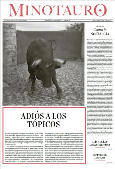 El nuevo número de Minotauro repasa la nueva temporada taurina con un enfoque crítico, más allá de los estereotipos que rodean a la Fiesta. En este monográfico dedicado a «Ferias» se reflexiona sobre la necesidad de romper tópicos y abandonar la nostalgia como base para construir el futuro de la tauromaquia. Textos de Rubén Amón, Antonio Cruz Romero, Jorge F. Hernández, Juan Diego Madueño, José Morente, Jaime Olmedo Ramos, Luis Pérez Oramas, El Tato y François Zumbiehl , acompañados por las fotografías de Bernardo Aja tomadas en la ganade ría de Xajay (Tequisquiapan, Querétaro, México) entre 2019 y 2020, analizan en profundidad los personajes, ganaderos y toros que forman parte de la actualidad taurina. Minotauro , un periódico de toros y toreros. Nace para defender los valores de la tauromaquia y su papel en la sociedad. Impulsado por el Club Matador y la Peña Antoñete , Minotauro es un foro internacional, libre, culto, con respeto a la historia y la tradición, con la vista puesta en el presente y en el futuro, y con la firme voluntad de ayudar a cerrar la brecha abierta entre toros y soc