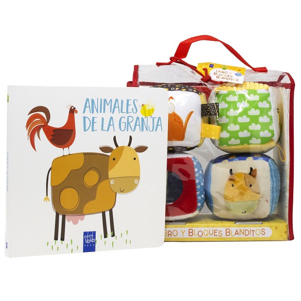 Maleta de plástico transparente, con un libro y 4 cubos de tela blanditos, con variedad de texturas y sonidos, con los que los más pequeños aprenderán a reconocer animales y colores.
