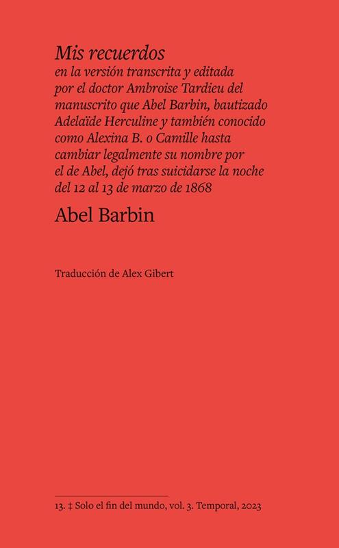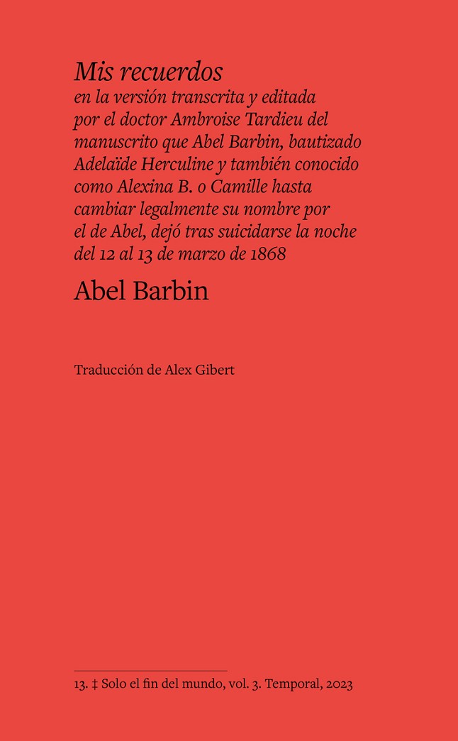 Las primeras memorias conservadas de una persona intersex, que vivió en el siglo XIX en Francia y que cambió legalmente su nombre, Herculine, por el de AbelEsta es la historia de cómo Adélaïde Herculine Barbin llegó a ser Abel Barbin, contada por él mismo. Fue una niña criada y educada en internados de monjas, a mitad del siglo XIX, hasta convertirse en institutriz en uno de ellos. Pero algo no encajaba. Una serie de cambios y sensaciones en ella precipitaron un desenlace irreversible: su reasignación legal como hombre y su partida a París. Allí comenzaría la escritura de su autobiografía, hasta su suicidio a los treinta años. El manuscrito original no se conserva íntegro, y solo disponemos de la versión transcrita por el médico forense en cuyas manos cayó el texto, y que Michel Foucault incluyó, un siglo después, en su estudio sobre el caso, que llamó y popularizó como Alexina B. Esta edición recoge solo el texto escrito por Barbin.