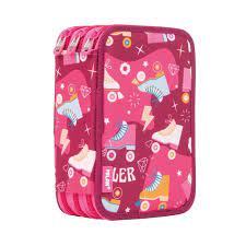 Kit 4 estuches con contenido, que permite mantener el material escolar siempre ordenado y de fácil acceso. Los 4 estuches interiores se pueden extraer y volver a colocar con el velcro. Serie especial Ninjutsu, silenciosos y divertidos ninjas saltan sobre las nubes. Diseño estampado sobre un fondo de color rojo con nubes de color crema y detalles en azul marino. Forro interior en color azul marino con dibujos de pequeñas estrellas shuriken. Material escolar incluido: 1 goma de borrar 4024, 2 sacapuntas (AFILA y MAXI), 1 lápiz de grafito HB, 3 bolígrafos COMPACT (azul, verde, y rojo), 1 regla de 15 cm, 12 lápices de colores Ergo y 12 rotuladores de punta cónica. Composición tejido: exterior y forro interior de poliéster. Medidas: 22,5 x 11,5 x 11 cm.