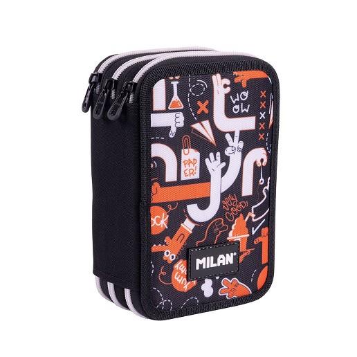 Estuche plumier de 3 pisos que permite mantener el material escolar siempre ordenado y de fácil acceso. Material incluido: 1 goma de borrar 4024, 1 sacapuntas AFILA, 1 lápiz de grafito HB, 3 bolígrafos P1 (azul, negro y rojo), 1 regla triangular de 15 cm, 12 lápices de colores triangulares, 6 lápices de colores metalizados de madera negra, 5 evidenciadores fluorescentes, 1 tijeras Basic y 18 rotuladores de punta cónica. Serie especial Fingers, inspirada en los gestos expresivos de comunicación universal y juegos de manos, que combina colores negro, naranja y blanco en un divertido estampado. Composición tejido: poliéster. Medidas: 19,5 x 13 x 7,5 cm.
