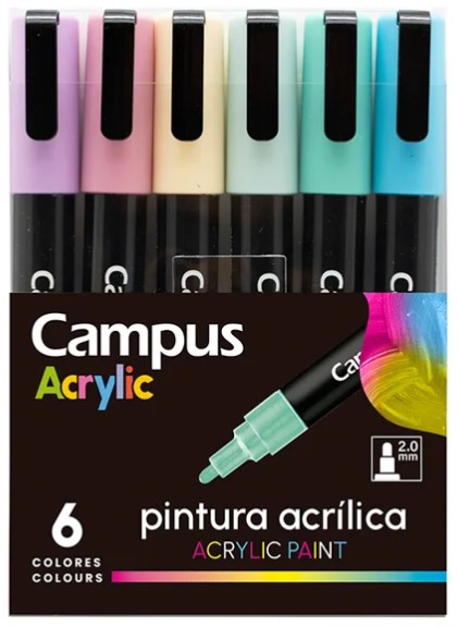 Rotuladores de pintura acrílica. Base al agua, opaca y de secado rápido. Los marcadores acrílicos son versátiles para todo tipo de trabajos. Todotipo de superficies. Punta de 2.0 mm. Solo necesita agitar el marcador, apretar la punta sobre la superficie a dibujar y deslizar. Por favor no exponer a la luzsolar directa ni a altas temperaturas. Vuelva a tapar firmemente después de su uso. Colores pastel: lavanda, amarillo, verde lima, turquesa, azul y rosa. Envase: 6 unidades.
