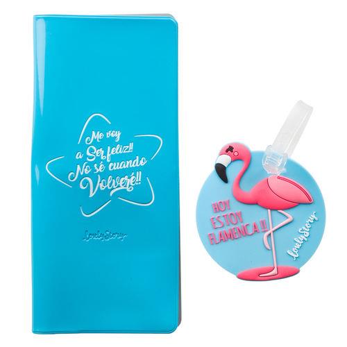 • PORTADOCUMENTOS DE VIAJES + IDENTIFICADOR DE MALETA DE FLAMENCO CON EL MENSAJE: ME VOY A SER FELIZ!! NO SÉ CUANDO VOLVERÉ!!