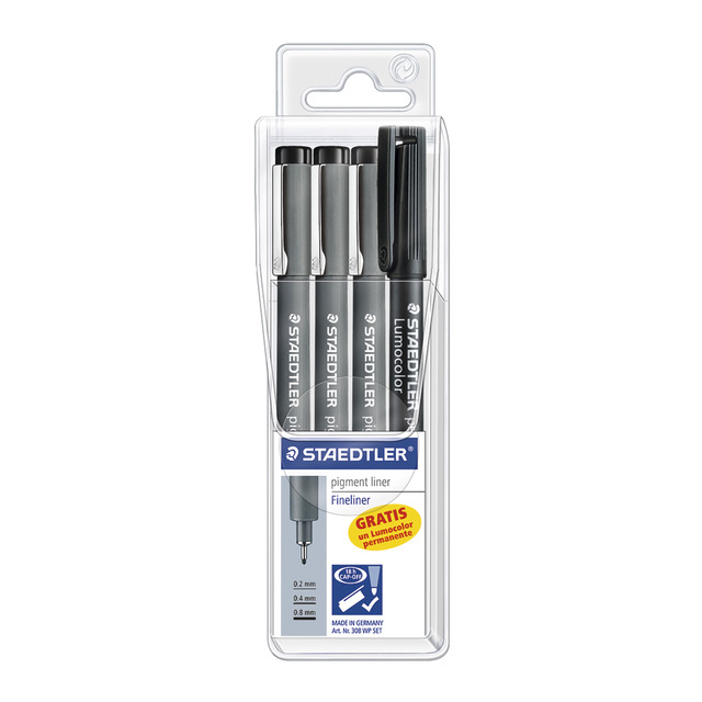 Estuche 3 Rotuladores calibrados Pigment Liner 308 + Rotulador Lumocolor permanente.