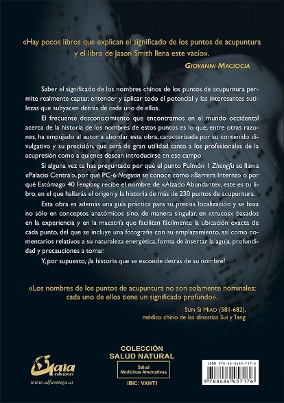 Si alguna vez te has preguntado por qué el punto Pulmón I Zhongfu se llama "Palacio Central", por qué PC-6 Neiguan se conoce como "Barrera Interna" o por qué Estómago 40 Fenglong recibe el nombre de "Alzado Abundante", este es tu libro, en el que hallarás el origen y la historia de más de 230 puntos de acupuntura.