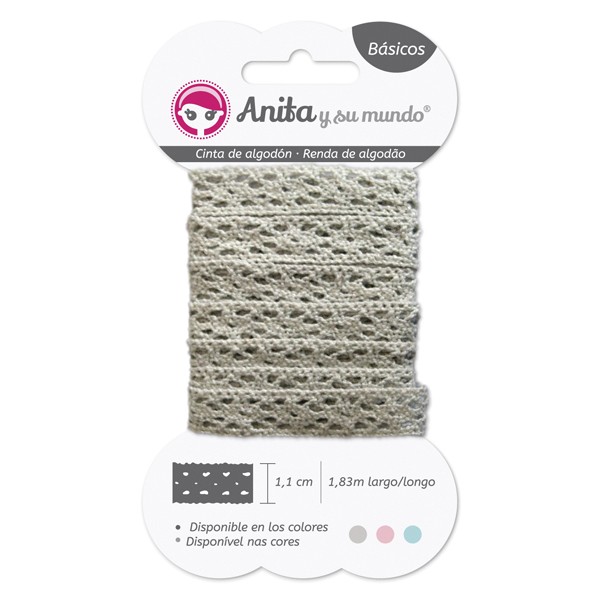 • CINTA DE ALGODÓN PUNTILLA GRIS 1.1CM DE ANCHO 1.83M DE LARGO