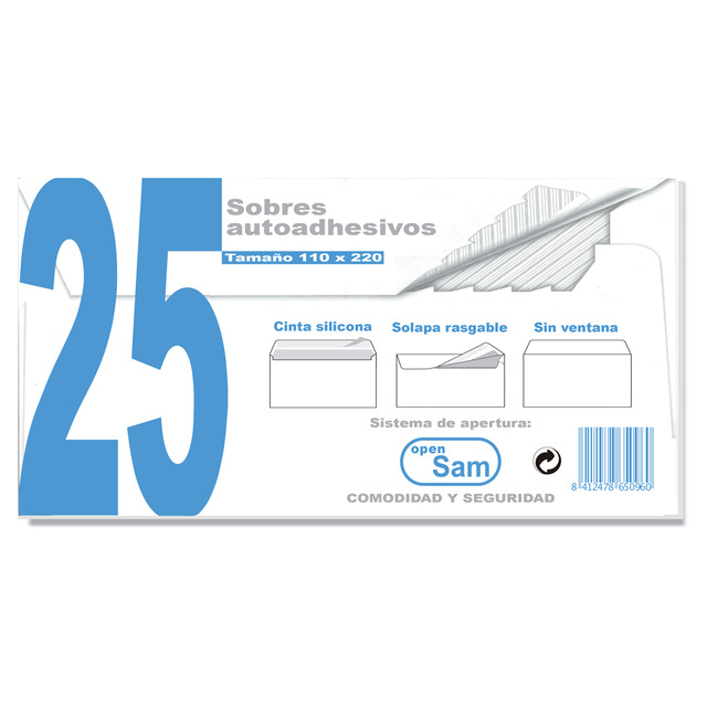 • PAQUETE 25 SOBRE COMERCIAL 110X220 MM BLANCO CIERRE TIRA SILICONA
