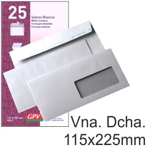 • PAQUETE 25 SOBRES BLANCOS 115 X 225 MM 90 GR ABRE FÁCIL VENTAÑA DERECHA